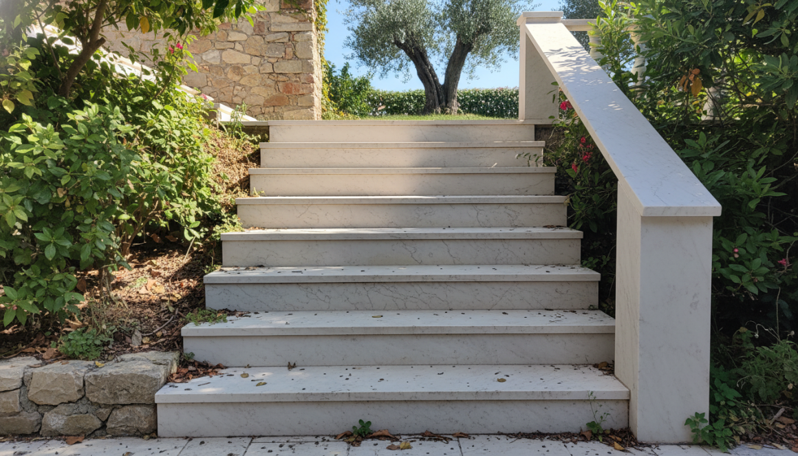 ЛестницыМрамор Бьянко Перлино (Bianco Perlino) для лестниц предлагает мягкий кремово-бежевый тон с нежными светлыми прожилками и ракушечными вкраплениями, создавая теплый и гармоничный вид. Итальянский мрамор обеспечивает элегантность и прочность ступеней, полированная или матовая поверхность гарантирует безопасность.