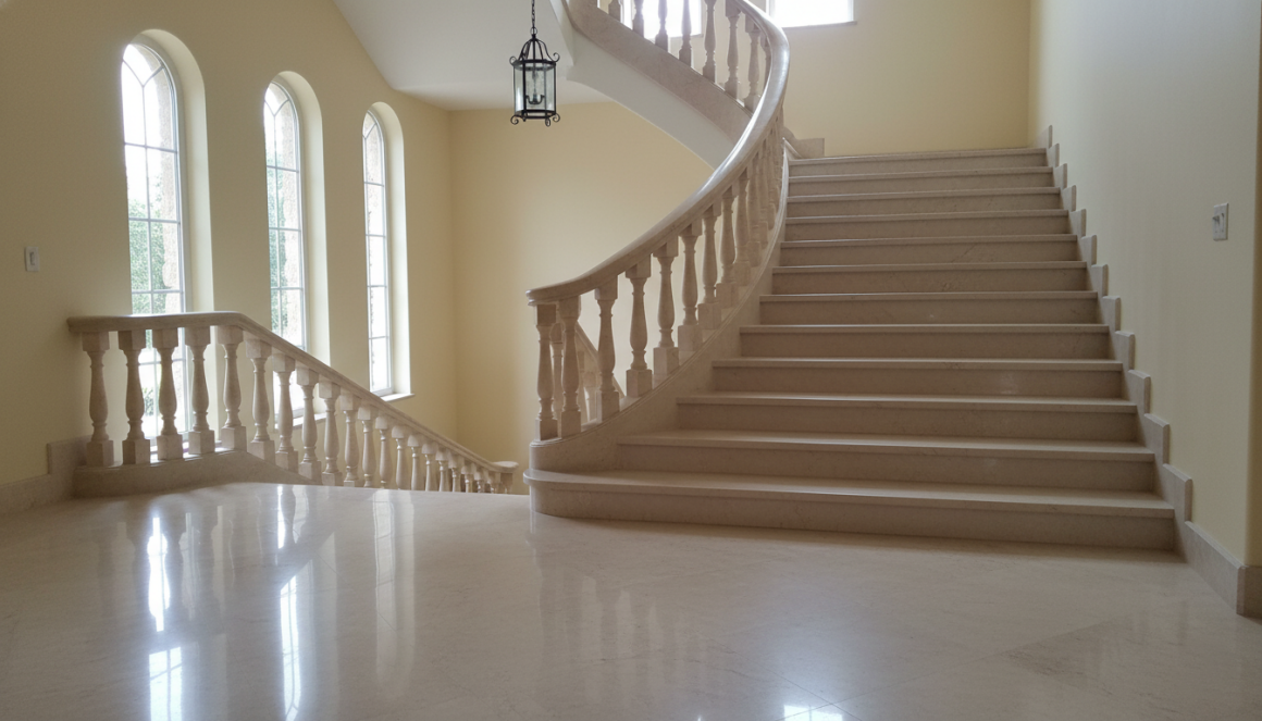 ЛестницыМраморная плитка Крема Марфил Экстра (Crema Marfil Extra), полированная, для лестниц даёт абсолютно ровный кремовый тон высшей селекции без единой прожилки и дефекта, создавая идеально чистый классический вид. Испанский мрамор экстра-класса выдерживает максимальную нагрузку, зеркальная полировка обеспечивает премиальный блеск и безопасность.