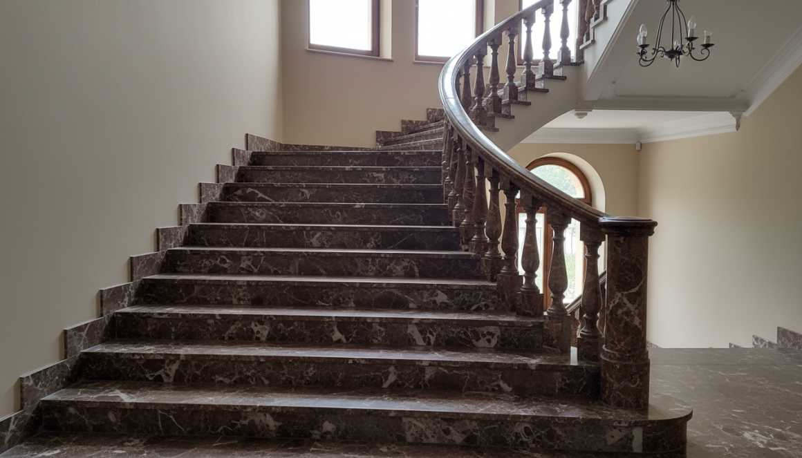 ЛестницыМраморная плитка Имперадор Дарк Классик (Emperador Dark Classic), полированная, для лестниц создаёт насыщенный шоколадно-коричневый фон с выразительными светлыми прожилками, добавляя роскоши и тепла. Испанский мрамор выдерживает интенсивную нагрузку на ступенях и подступенках, зеркальная полировка усиливает глубину цвета.