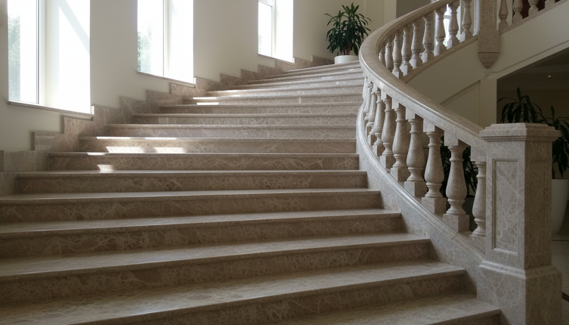ЛестницыМраморная плитка Имперадор Лайт (Emperador Light), полированная, для лестниц предлагает светло-коричневый фон с мягкими бежевыми и золотистыми прожилками, создавая тёплый и элегантный вид. Испанский мрамор выдерживает нагрузку на ступенях и подступенках, зеркальная полировка подчёркивает глубину цвета и добавляет блеска.