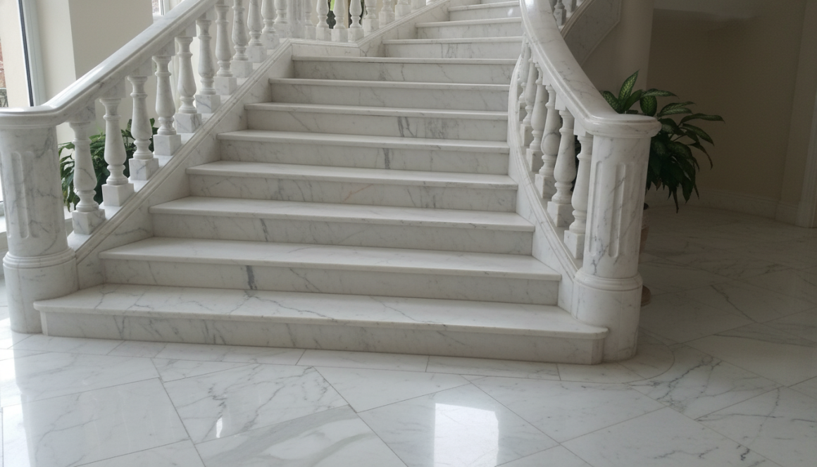 ЛестницыМраморная плитка Мисти Вайт Роуз (Misty White Rose), полированная, для лестниц даёт очень светлый, почти белый фон с нежными розово-сиреневыми прожилками и лёгкой дымкой. Турецкий мрамор премиум-класса обеспечивает элегантность ступеней и подступенков, зеркальная полировка добавляет воздушного блеска и сохраняет безопасность.