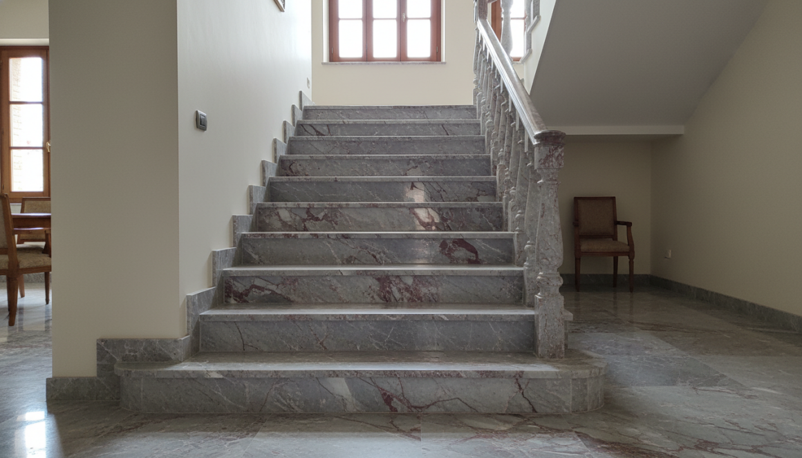 ЛестницыМраморная плитка Саломе (Salome), полированная, для лестниц предлагает светло-бежевый фон с золотисто-коричневыми и серыми прожилками, создавая тёплый и элегантный вид. Турецкий мрамор выдерживает нагрузку на ступенях и подступенках, зеркальная полировка подчёркивает глубину рисунка и добавляет благородного блеска.