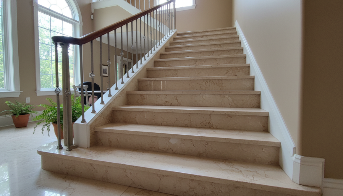 ЛестницыМраморная плитка Сильвия Оро СС (Silvia Oro CC), полированная, для лестниц даёт светло-бежевый фон с яркими золотисто-коричневыми и серыми прожилками в стиле классического травертина. Турецкий мрамор премиум-класса выдерживает нагрузку на ступенях и подступенках, зеркальная полировка подчёркивает золотые вены и добавляет благородного блеска.