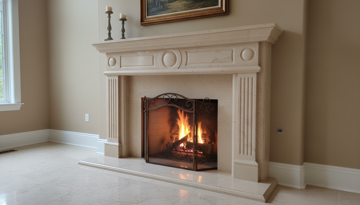 КаминыСильвия Оро СС, полированная, для каминов создаёт тёплый портал с выраженными золотыми прожилками на светло-бежевом фоне. Жаростойкий турецкий мрамор идеален для топок, зеркальная поверхность усиливает отражение пламени и золотое сияние.