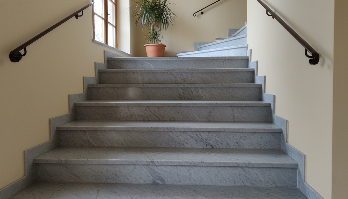 ЛестницыМраморная плитка Соло Блю (Solo Blue), полированная, для лестниц создаёт редкий и завораживающий вид: глубокий синий фон с белыми и серыми прожилками, напоминающий ночное небо. Турецкий мрамор премиум-класса выдерживает нагрузку на ступенях и подступенках, зеркальная полировка подчёркивает космическую глубину цвета.