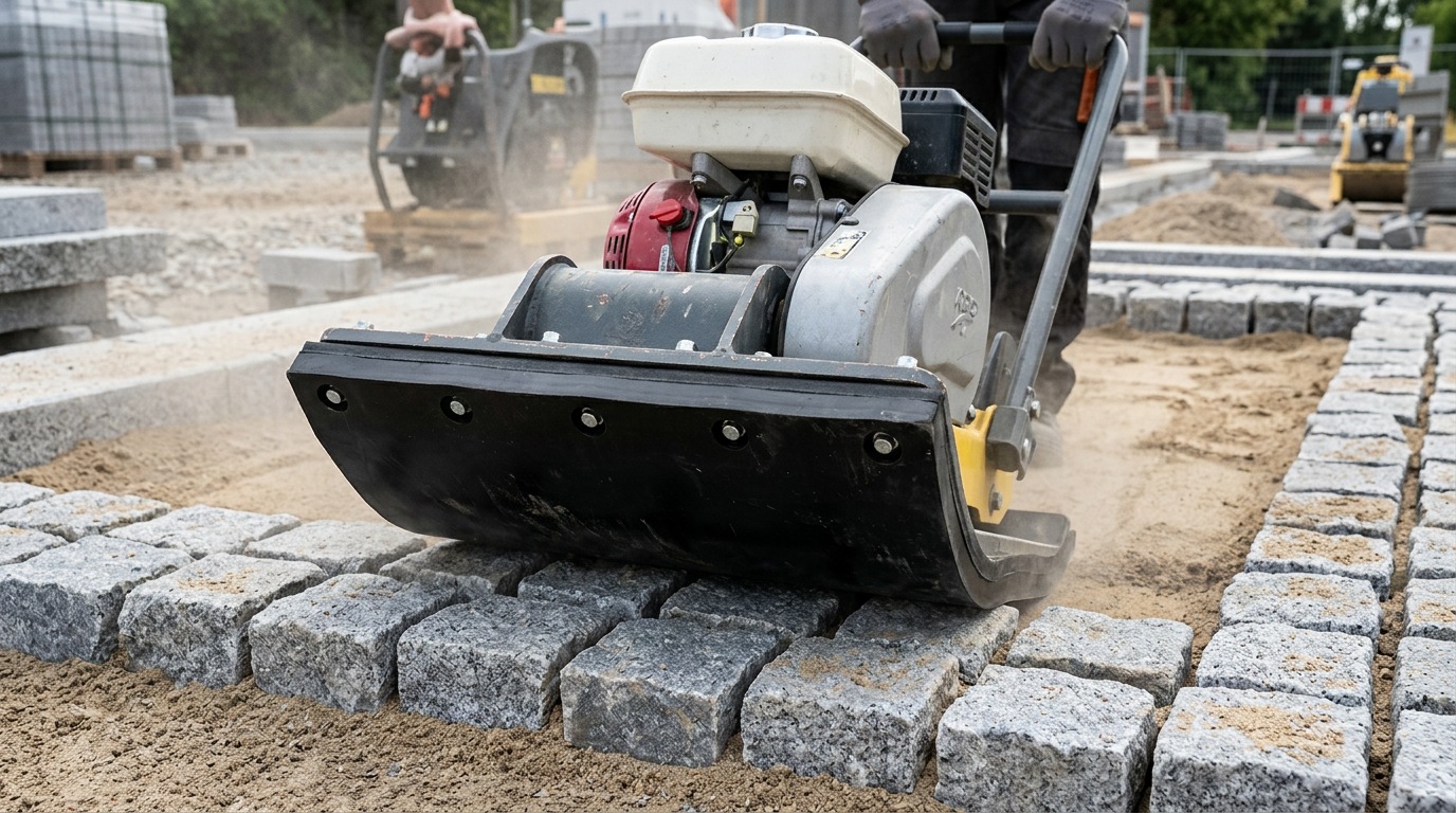 Масса виброплиты подбирается под толщину камня: для брусчатки 50 мм - 90-130 кг, для 100 мм - 130-200 кг. Технология описана в статье о выборе виброплиты.